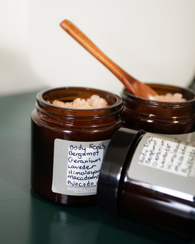 A blend of pink himalayan salt infused with bergamot, geranium, lavender, and avocado oil.